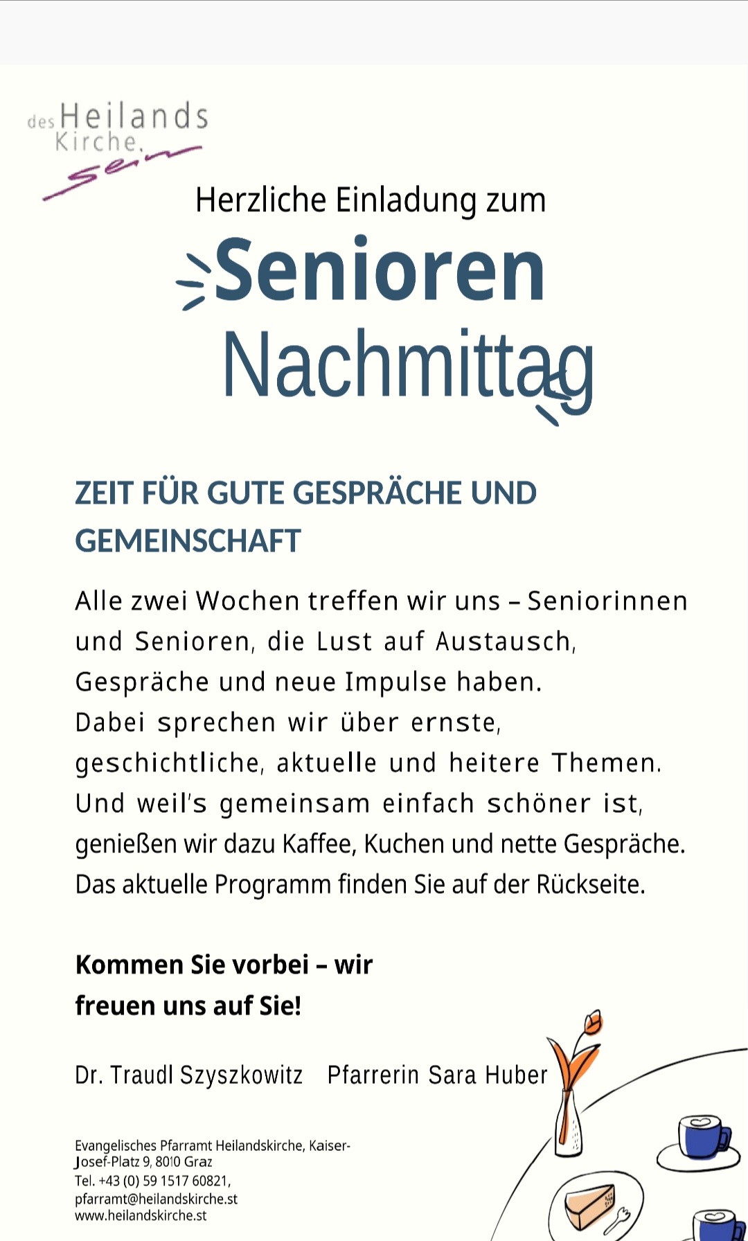 Der Seniorenclub der Heilandskirche trifft sich 14-tägig, jeweils dienstags um 15.30 Uhr im Evi Krobath Saal der Heilandskirche, Martin-Luther-Haus (außer in den Sommerferien).